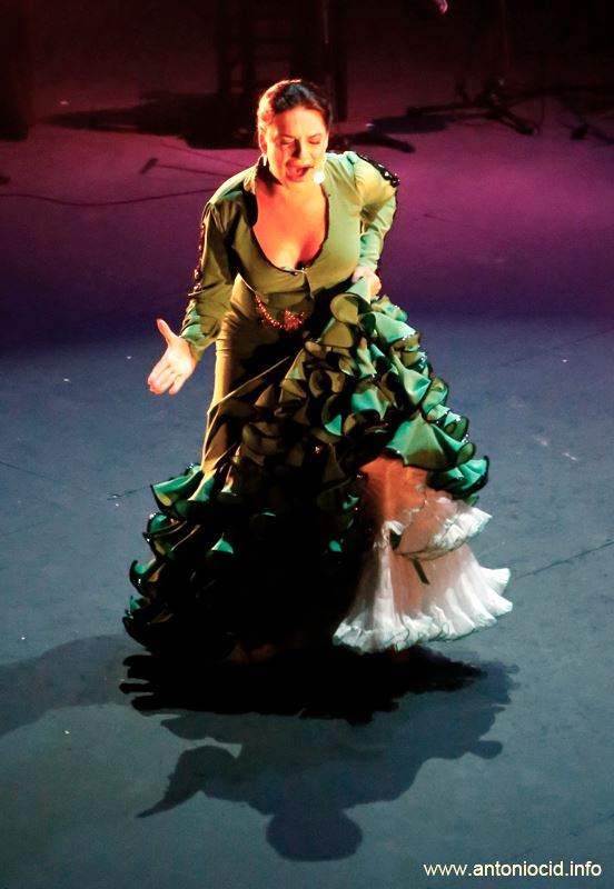 Lo de La Tobala fue un aquí estoy yo. La cantaora quiso dejar claro que está fuerte, viva y con nuevo proyecto. El título es 'Entre enaguas', que será un disco a principios del próximo año. Y esta noche, preestrenado en vivo en la Muestra de Flamenco 2013, fue un estribillo que se mecía de viva voz... y bajo el traje verde. Vestida de esperanza emprendió un dilatado concierto con forma escénica y, además, coreografía encargada a Rubén Olmo. No sólo cantó, sino que bailó (y mucho), recorrió distintas posiciones en la tabla, mudó y mudó de ropa cosida por Salao, y se hizo acompañar de formas diversas.